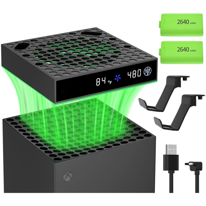 Tobo Cooling Fan for Xbox Series X, Cooling system for Xbox Series X with Automatic Fan Speed Adjustable by Temperature and 2 Rechargeable Battery Packs for Xbox Controller,