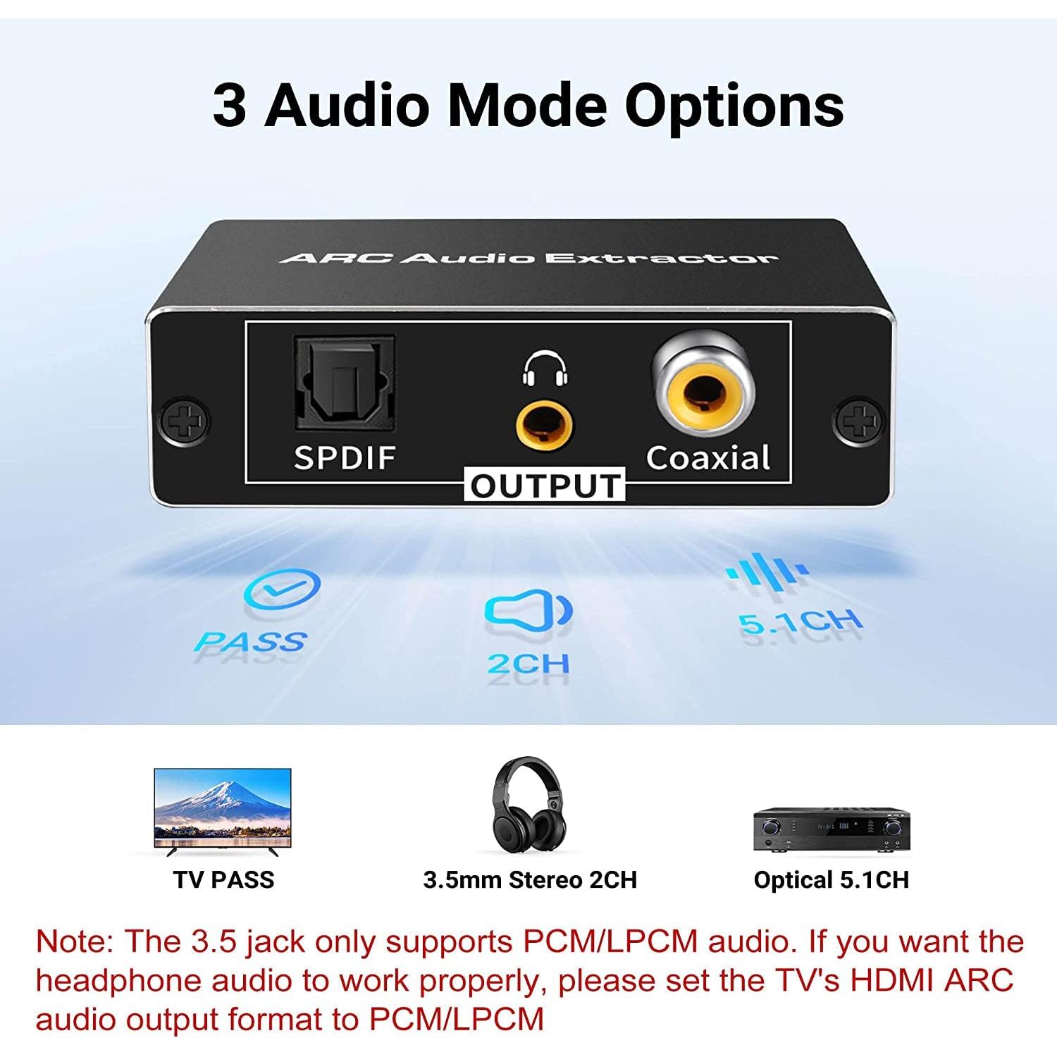 - 2CH Mode: Set 2CH for analog stereo audio. Extracts the digital 2CH PCM stereo audio signal from the ARC HDMI input while converting it to 2CH analog stereo output via its analog 3.5mm/optical SPDIF/coaxial output.