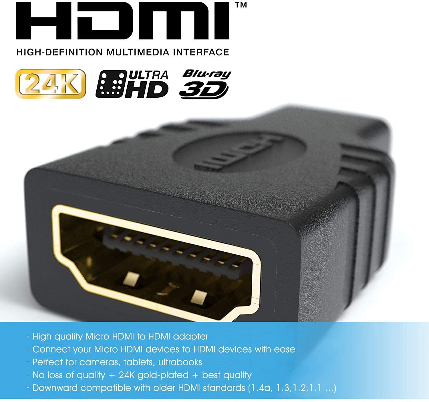 No loss of quality + 24K gold-plated + best quality, this high-speed micro HDMI to HDMI female adapter supports clear signals, minimal interference and physical strain.