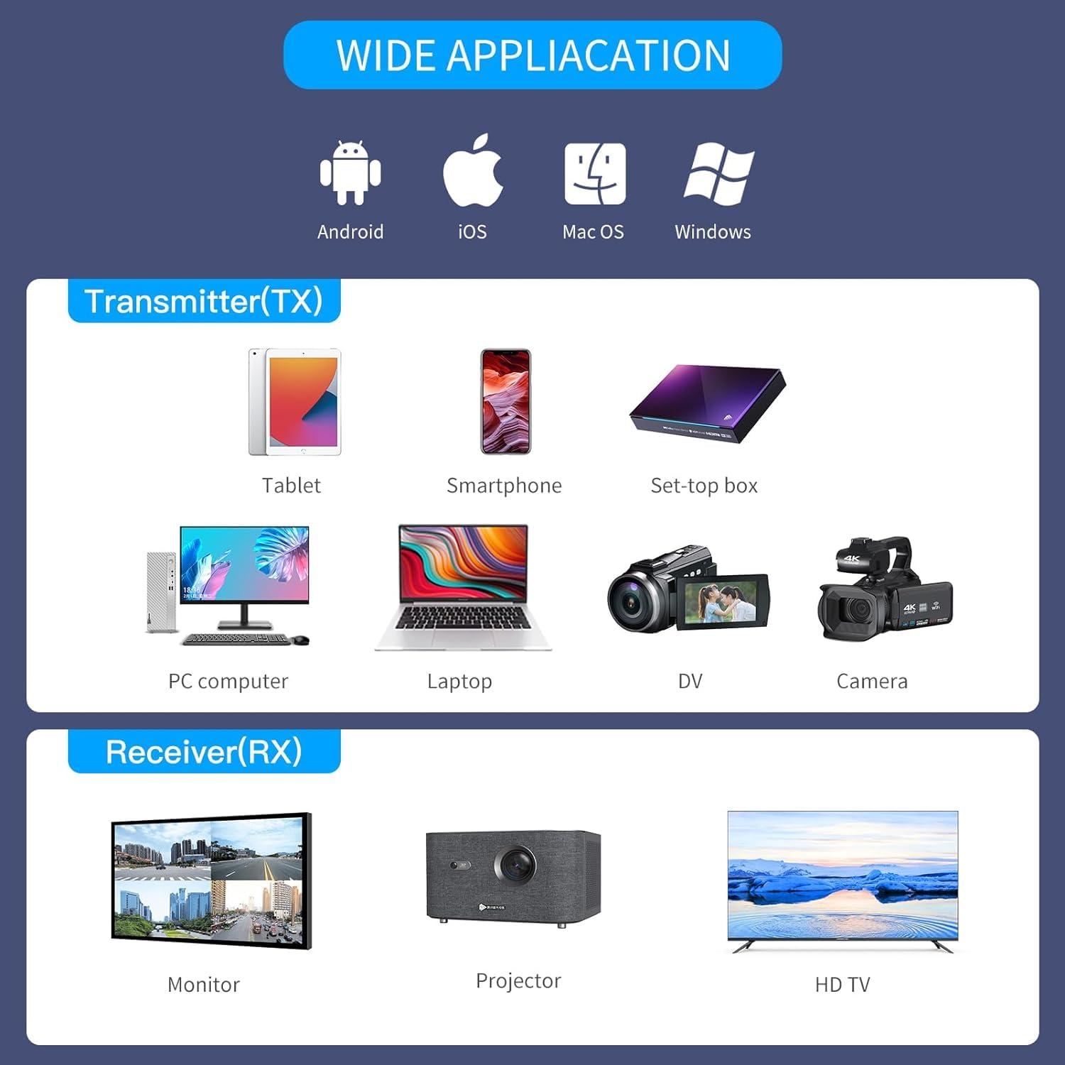 - [Wide Compatibility]-The wireless video transmission and receiver is small and easy to carry. Compatible with various devices such as laptops, PCs, Blu-ray players, cameras, DVDs, DSLRs, set-top boxes, cable/tellite boxes, tablets, smartphones, and more. (source devices without HDMI interface can also use the transmitter via an HDMI converter).
